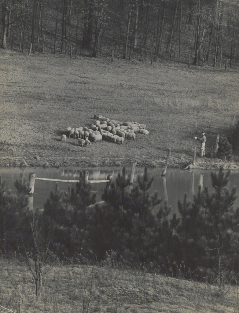 This undated Joe Munroe photograph shows Walker’s Pond (now part of the Brown Family Environmental Center at Kenyon College) with H. H. Walker and a border collie herding sheep. Image courtesy of the Walker Family.